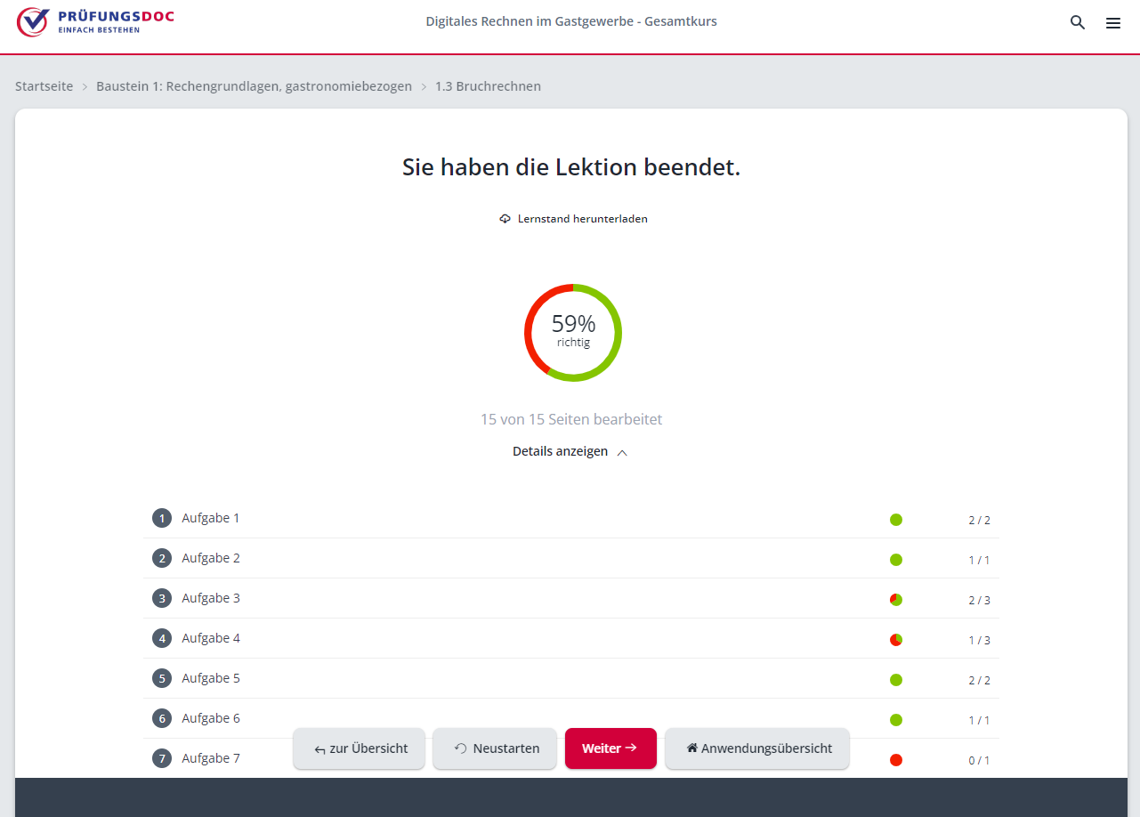 Nach Abschluss jeder Lektion erhält der Lernende direkt eine Rückmeldung über den erreichten Wissensstand; das motiviert und spart Zeit, denn dadurch ist eine zielstrebige Arbeit möglich.