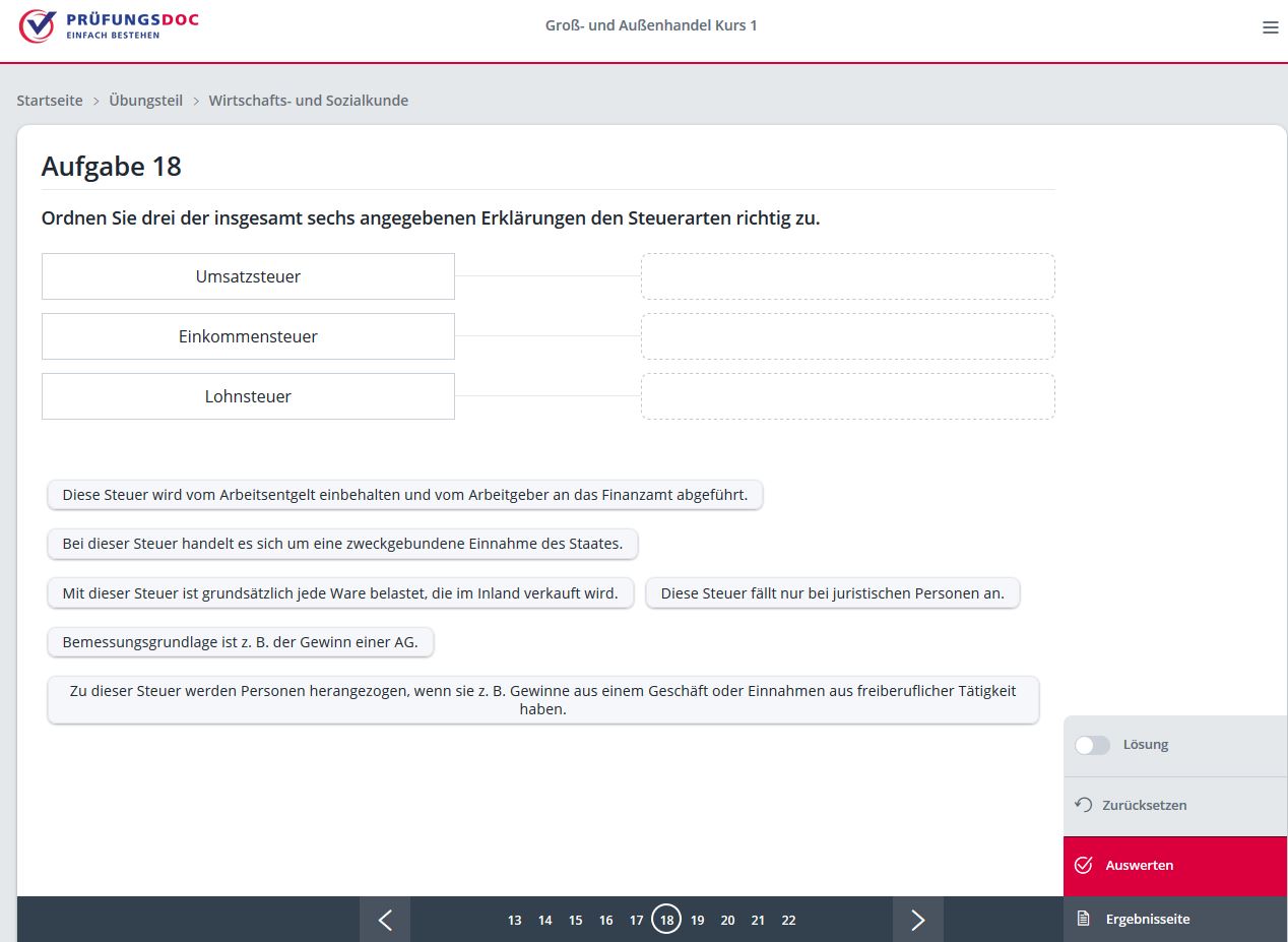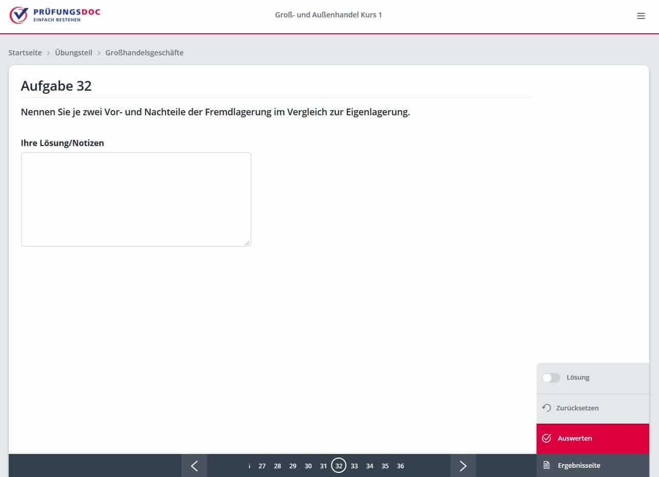 Anschließend können die Aufgaben in Form einer Prüfungssimulation unter den realen Bedinungen (zeitliche Begrenzung, Ergebnisse werden erst nach Abgabe angezeigt, keine Tipps möglich, Endnote etc.) der Abschlussprüfung bearbeitet werden. Hierdurch sind ein Abbild des eigenen Lernstands sowie ein Eindruck über die Bearbeitung der Abschlussprüfung möglich.