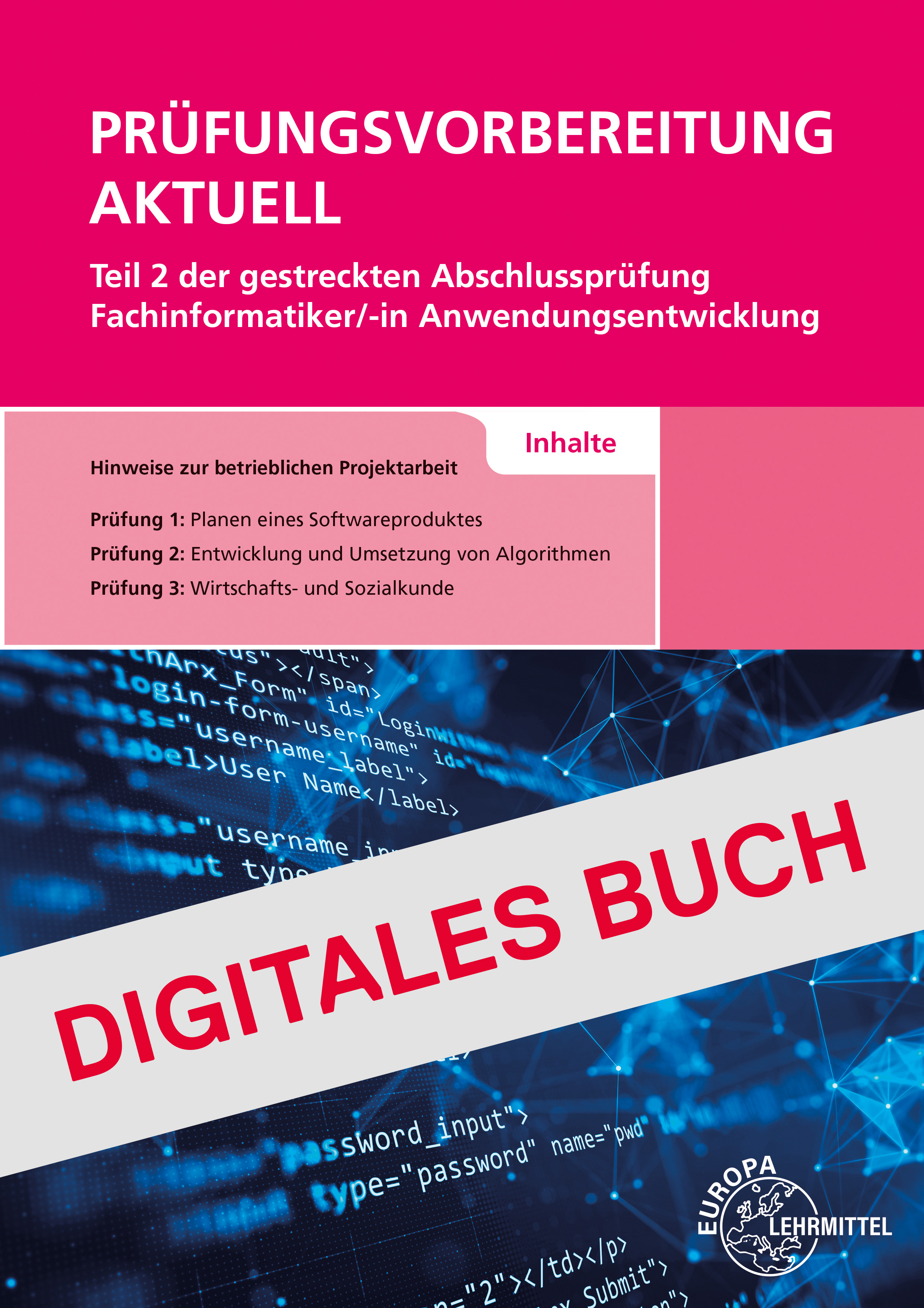 - Jeweils zwei Prüfungssimulationen in den drei Prüfungsbereichen „Planen eines Softwareproduktes“, „Entwicklung und Umsetzung von Algorithmen“ und „Wirtschafts- und Sozialkunde“
