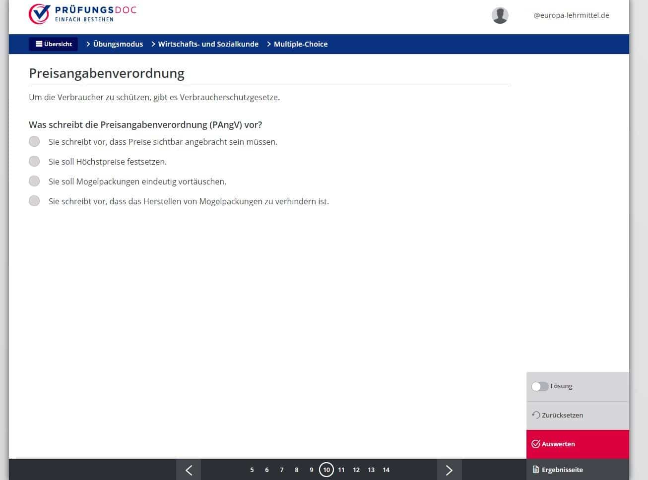 Sie können die Fragen im Übungsmodus trainieren oder eine Prüfungssimulation durchführen.