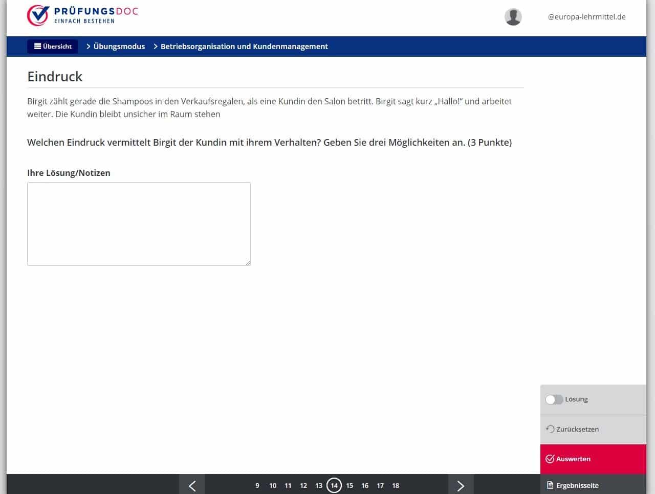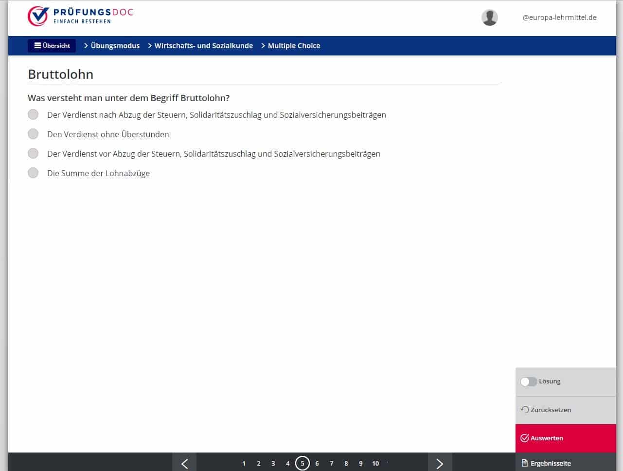 Prüfungsdoc ermöglicht webbasiertes Lernen, Üben und Wiederholen zur Vorbereitung auf Klausuren sowie die Zwischen- und Abschlussprüfung inkl. Simulation der Original-Prüfungen mit direkter Auswertung der Ergebnisse. Optimiert zur Nutzung auf Desktop, Tablet und Smartphone.