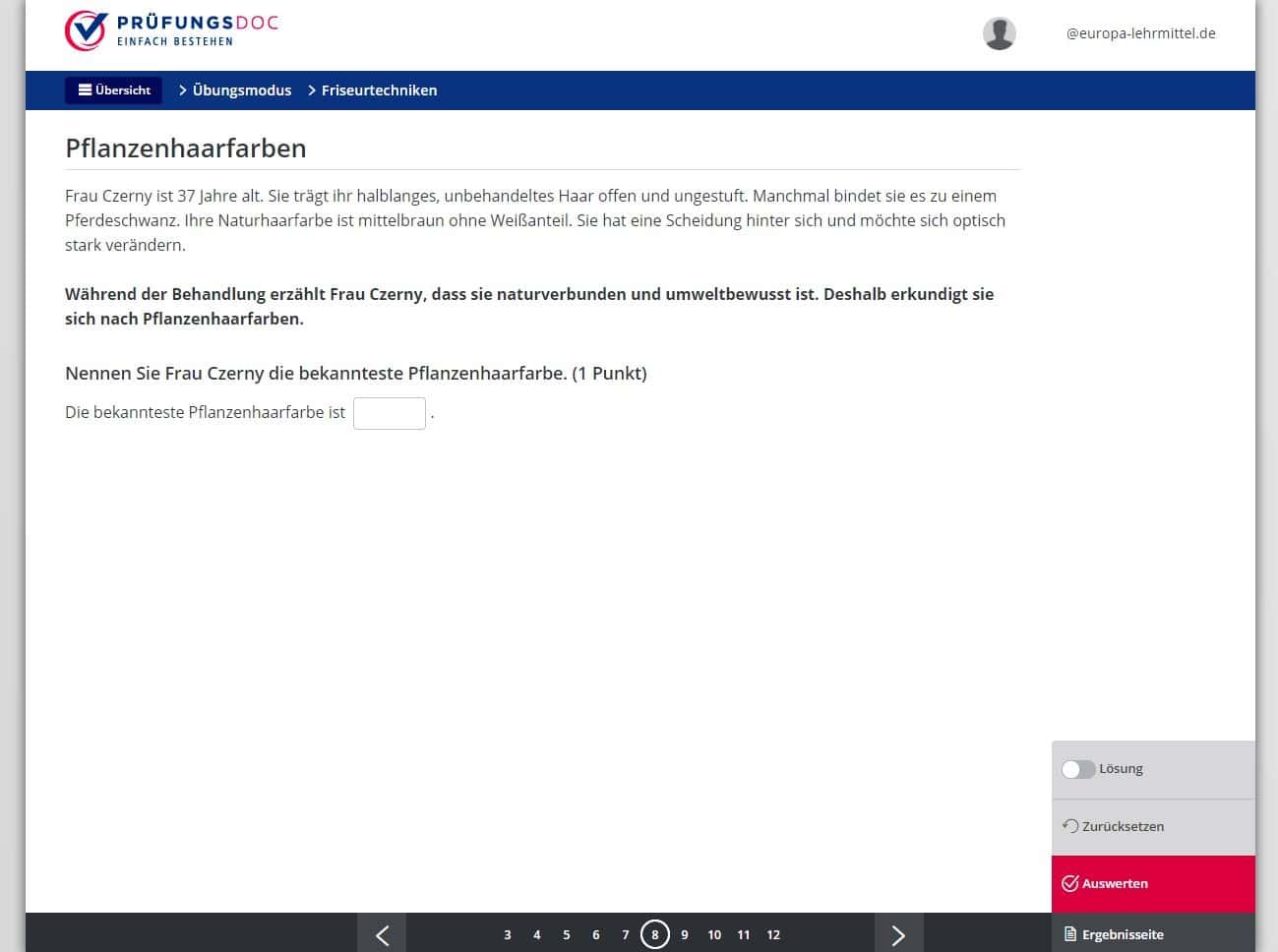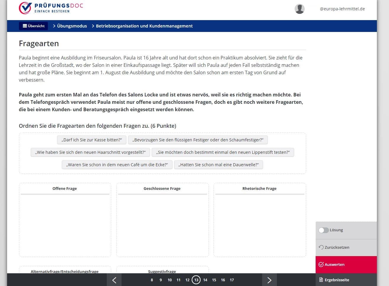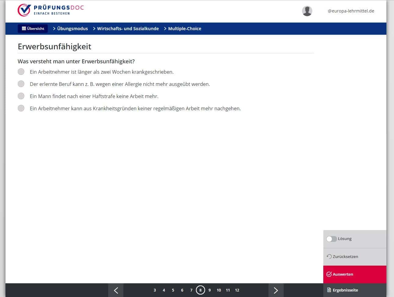 Prüfungsdoc ermöglicht webbasiertes Lernen, Üben und Wiederholen zur Vorbereitung auf Klausuren sowie die Zwischen- und Abschlussprüfung inkl. Simulation der Original-Prüfungen mit direkter Auswertung der Ergebnisse. Optimiert zur Nutzung auf Desktop, Tablet und Smartphone.